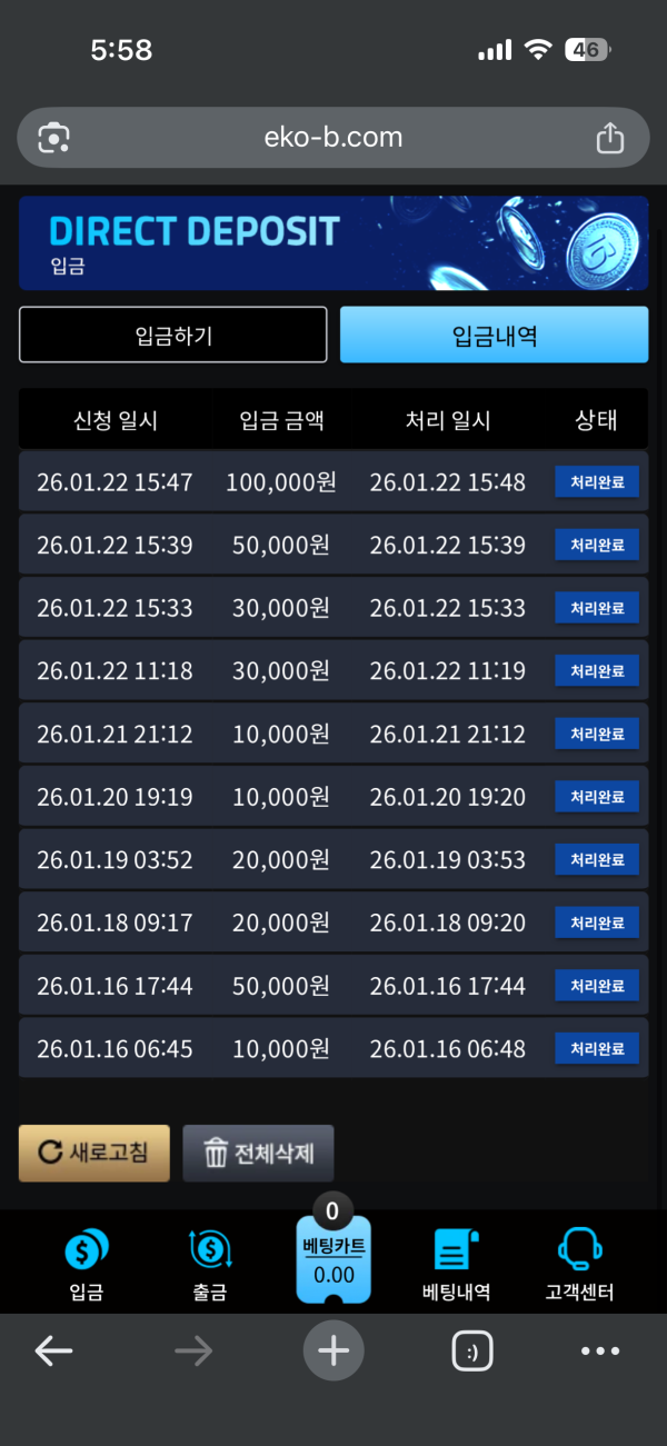 에코벳 후시 2026-01-22 18:00:04 마나다라마 조회 31 | 추천 0 0 이곳저곳 이용하다근 1년동안은 에코벳만 이용하고있습니드사고한번없고 충환전빠르며 위로금등 각종이벤많이해서 너무 잘이용하거있습니다추천드랴요! 0 0